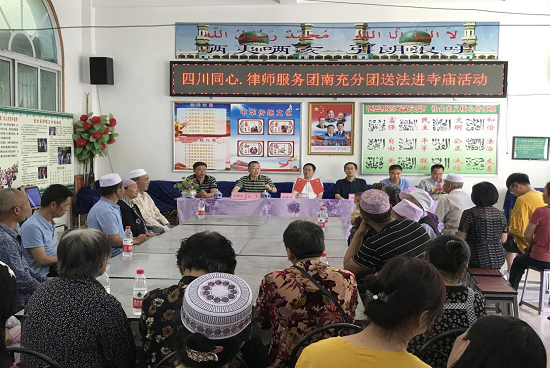 在汶川县清真寺,分团一行在汶川县司法局、县委统战部相关领导的陪同下开展了宗教系列法治宣讲活动。市律协副会长、四川百柯律师事务所主任肖飞向信众们宣讲了《宪法》、《中华人民共和国宗教法》、《宗教事务条例》,结合涉宗教事务典型案例,引导信众们在宗教活动中要学法、尊法、守法、 用法,增强法治意识。宣讲结束后,分团成员与信众们进行了交流,并现场解答了他们关于生活、家庭及宗教场所建设与审批等方面的问题。教职人员和信众近 50 余人参加宣讲活动。