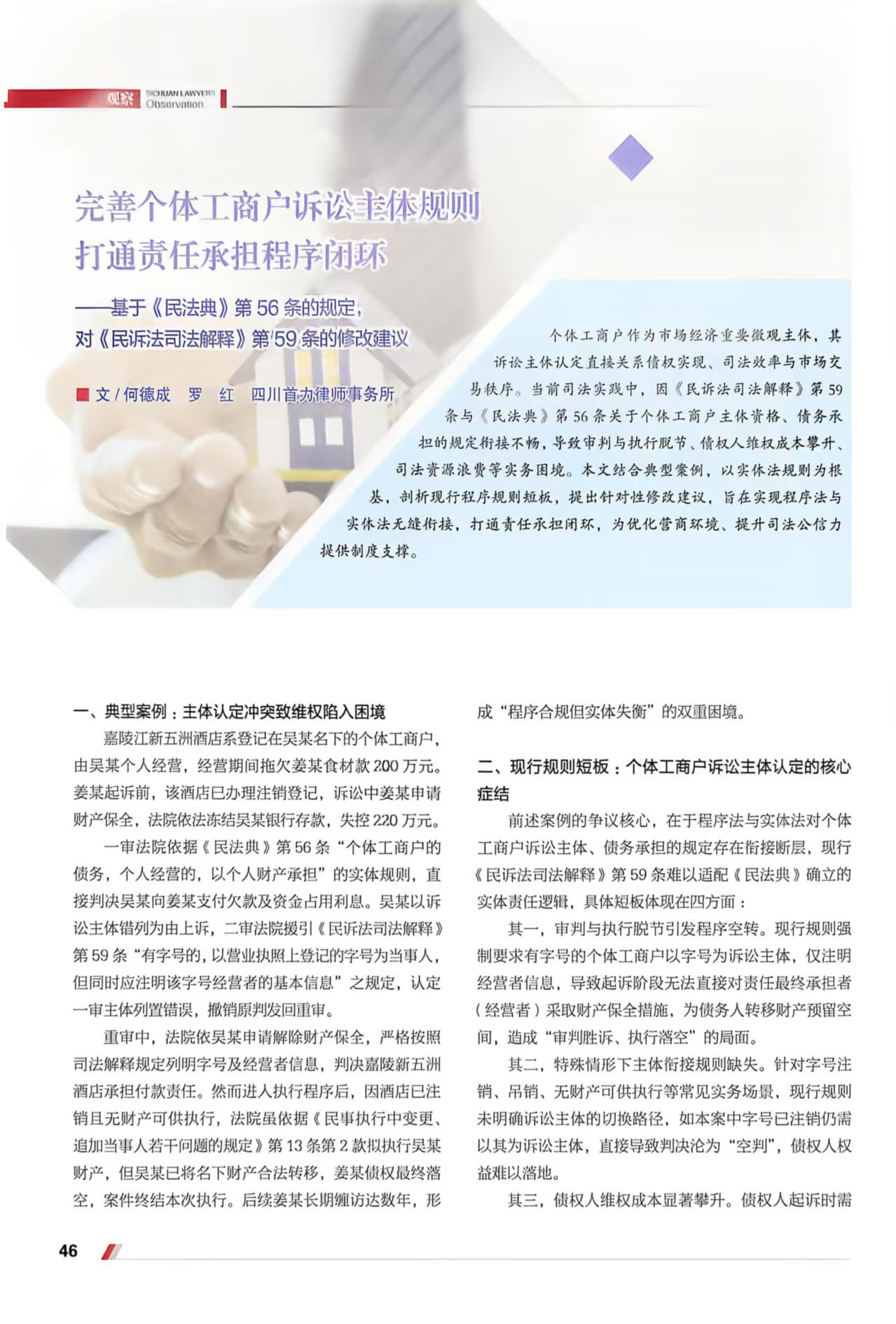 近日,由四川省律师协会主办的行业权威期刊《四川律师》2026年第1期(总第九十五期)正式出刊,四川首力律师事务何德成、罗红两位律师共同撰写的完善个体工商户诉讼主体规则 打通责任承担程序闭环一文成功入选观察”专栏,面向全省律师行业公开发表。